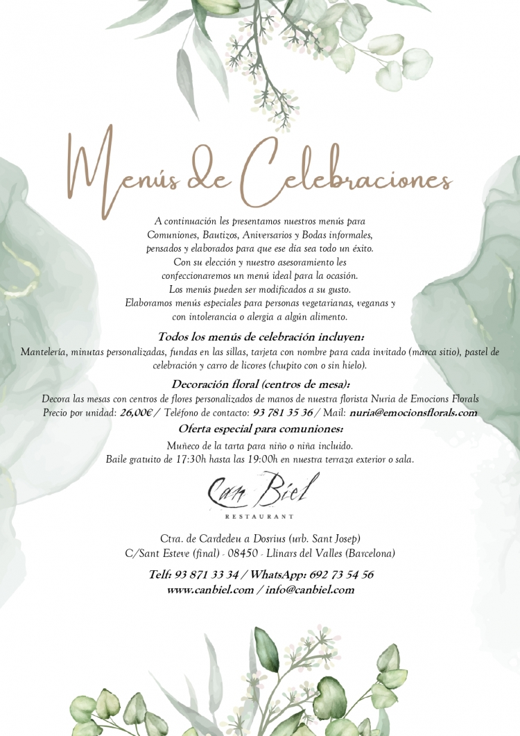 Menús pensats i elaborats per a celebracions de Comunió, Noces d'Or, Noces de Plata, Noces informals que busquen un preu més assequible o per a qualsevol tipus de celebració que cerquin un menú similar als casaments.