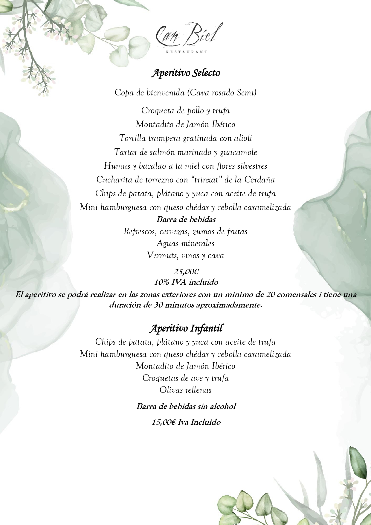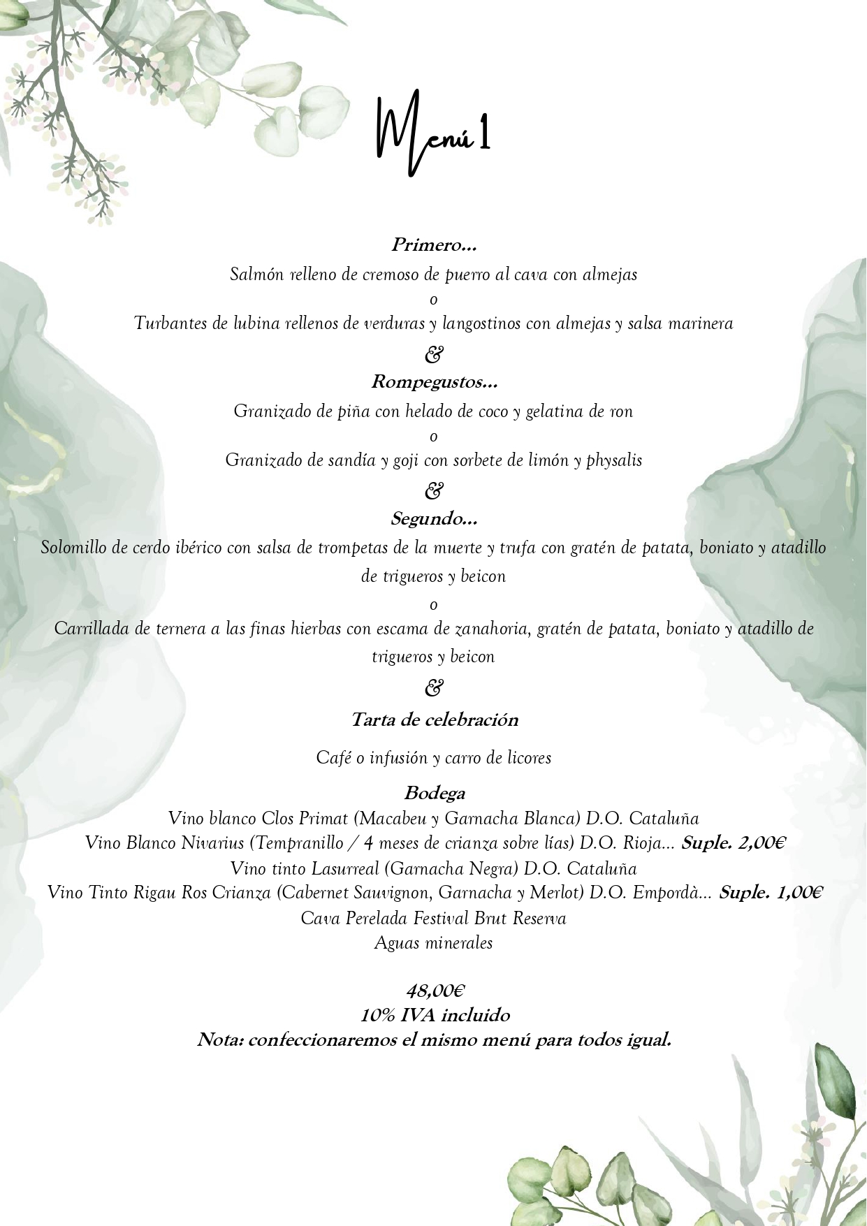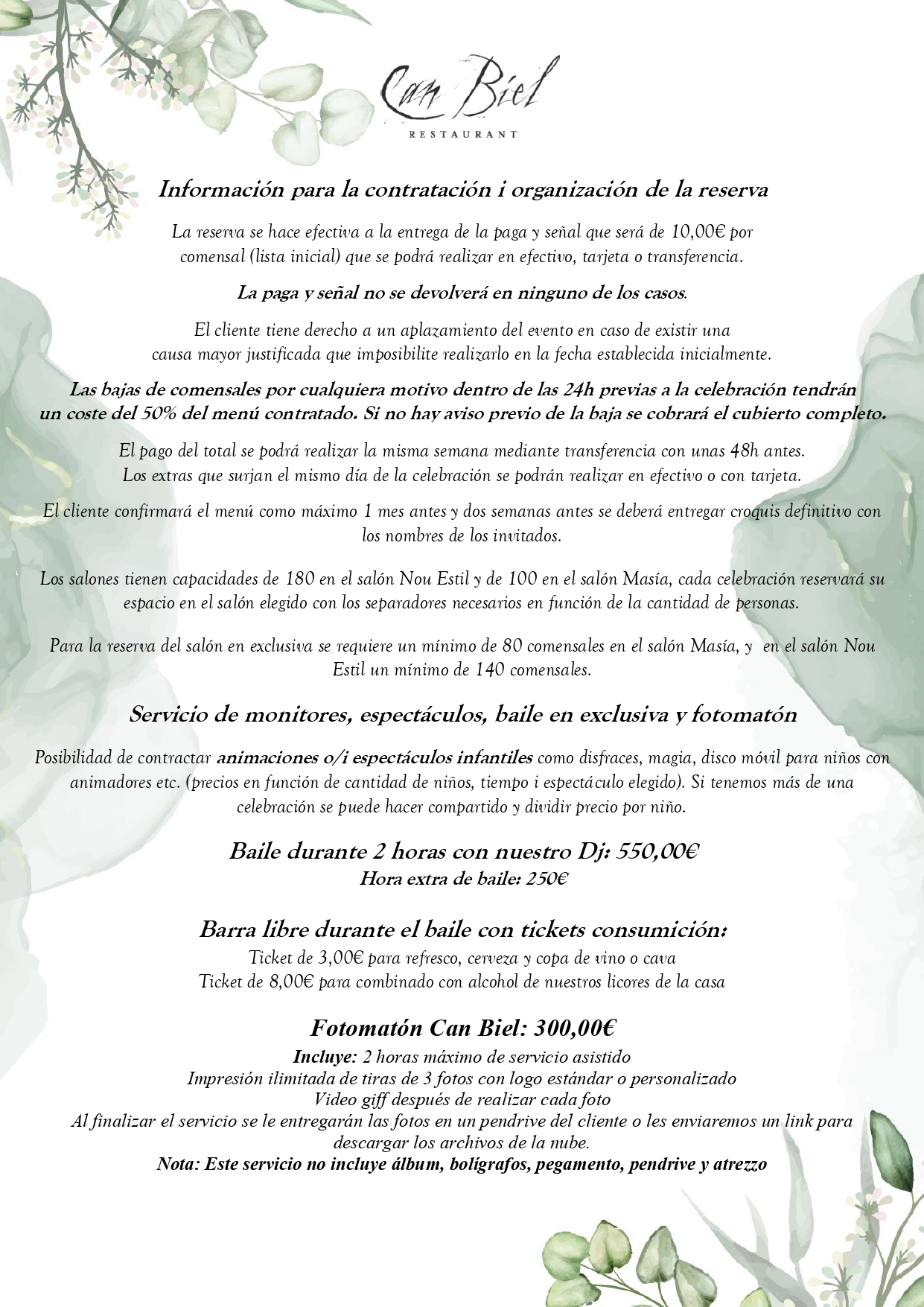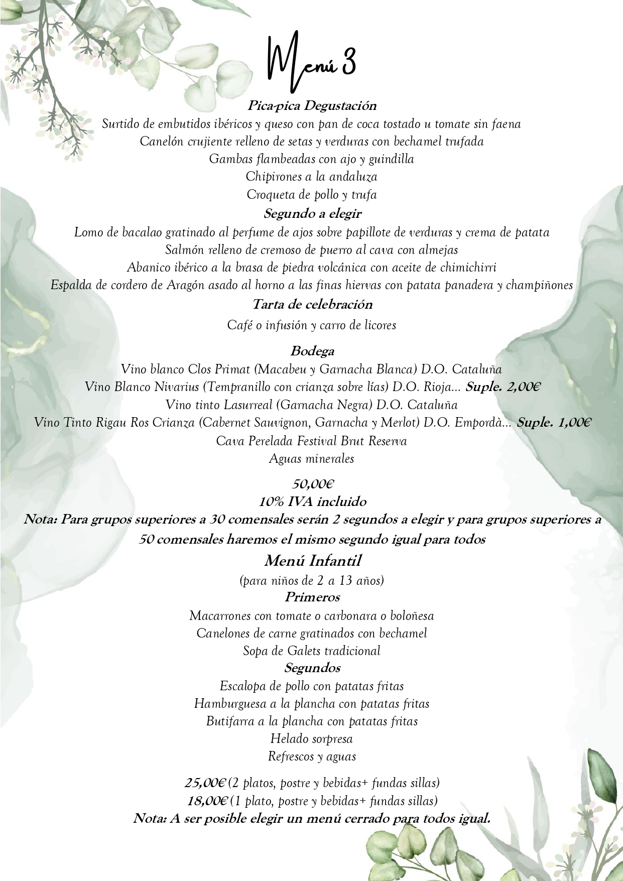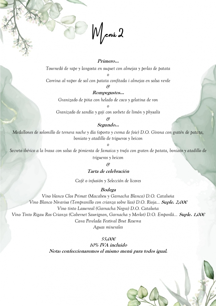 Aquests menús inclouen, pastís de celebració, carro de licors, minutes personalitzades i fundes a les cadires.